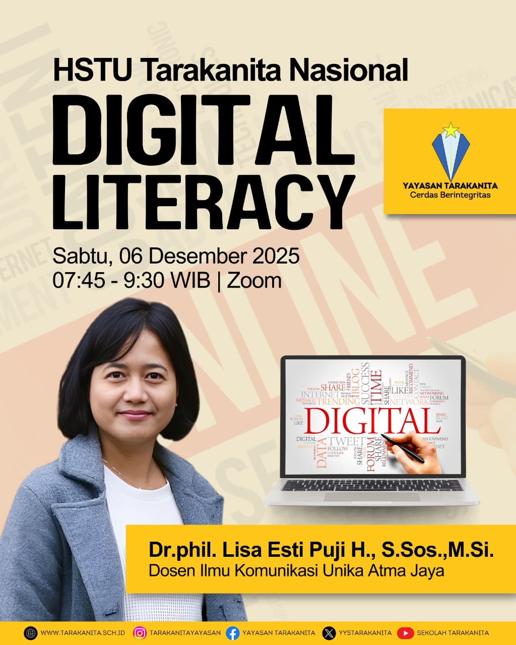 HSTU Tarakanita Nasional diselenggarakan padaĀ Sabtu, 6 Desember 2025, PukulĀ 07.45 - 09.30 WIB denganĀ tema "Digital Literacy" bersama narasumber : Dr.Phil. Lisa Esti Puji Hartanti, S.Sos., M.Si (Dosen Ilmu Komunikasi Unika Atma Jaya).